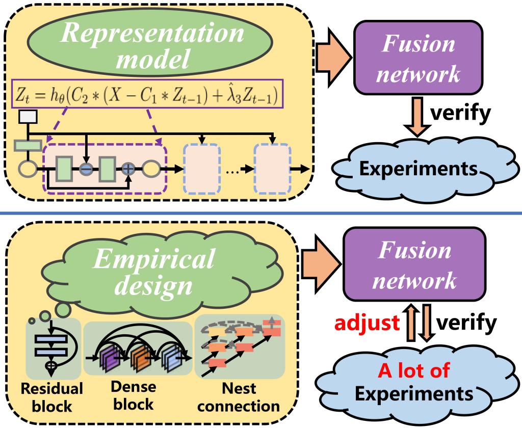 深度神经网络在视觉信息融合任务中已经取得了优异的性能,网络结构在融合过程中扮演着非常重要的角色。然而在人工智能领域,神经网络结构的设计仍然是一个黑盒问题。为了探索这一问题,该文提出了一种视觉信息融合的数学优化模型,并揭示了模型最优解与融合网络结构之间的联系。基于上述思想,该文提出了一种新颖的构建轻量级深度学习方法,使用优化模型指导网络结构设计,避免了使用试错策略来设计深度网络结构,如图1所示。为促进人工智能领域的发展,论文的算法代码和数据均已开源://github.com/hli1221/imagefusion-LRRNet。