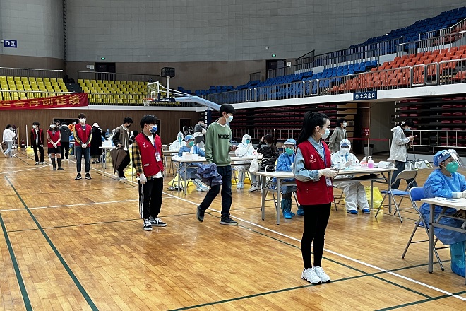 党员同学带领学院志愿者们奔忙在核酸检测地点各个地点、快速有序的开展检测工作。身穿“红马甲”的我们有条不紊的协助医护人员进行入口引导、核酸检测预登记、现场秩序维护、出口登记等工作。在服务过程中,志愿者们坚持用心服务,用爱值守,考虑到核酸排队需要一定的时间,我们还贴心准备了充电宝等设备,以防同学手机没电无法显示预制码等特殊情况。志愿者们分工协作,操作娴熟,为核酸检测工作的顺利进行贡献青春力量。