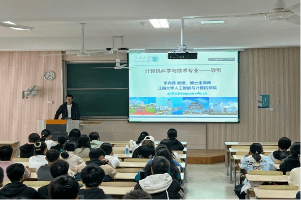 为提高2022级新生对学院办学理念、专业特色、行业优势的认识,牢固树立专业学习长远目标,10月5日-7日,学院分别召开了人工智能、数字媒体技术和计算机科学与技术三个专业的专业思想教育。其中,研究生院院长、博士生导师吴小俊教授担任人工智能专业的主讲;夏鸿斌副院长担任数字媒体技术专业的主讲;李光辉教授担任计算机科学与技术专业的主讲。参加讲座的还有学院党委副书记、副院长陈祎以及新生辅导员杜磊、米宁。