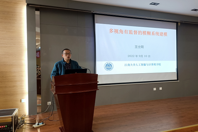 的王士同教授作为主讲导师。此次讲座的论题为《多视角有监督的模糊系统建模》。王士同教授从现在的人工智能热这一现象引出报告主题,以互联网、医学等领域的例子来剖析人工智能火爆的原因以及这一代人工智能所存在的缺陷,彰显了其团队研究的多视角有监督的模糊系统的优势及其对于人工智能迭代发展的重要影响力。接着王士同教授以通俗易懂的语言向同学们介绍了“多视角学习”以及“模糊系统”的概念、特征和原理,并详细讲解了其团队在多视角有监督的模糊系统建模方法上的研究过程以及做出的创新,希望给同学们带来启发。
