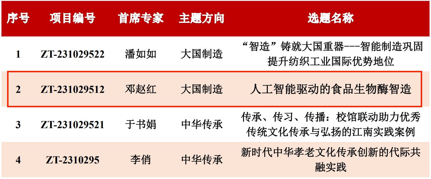 邓赵红教授作为首席专家申报的《人工智能驱动的食品生物酶智造》主题案例通过评审,获批“大国制造”主题立项。