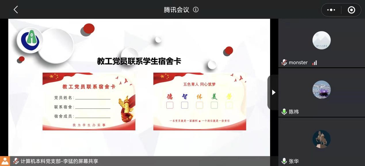 通过腾讯会议召开了党员教师联系学生宿舍工作启动仪式,院党委书记张华,院长刘渊,计算机科学与技术教工党支部,数字媒体技术教工党支部,公共教学与实验中心教工党支部全体党员、辅导员以及党员教师对接宿舍宿舍长参会。院党委副书记、副院长陈祎主持会议。