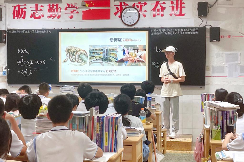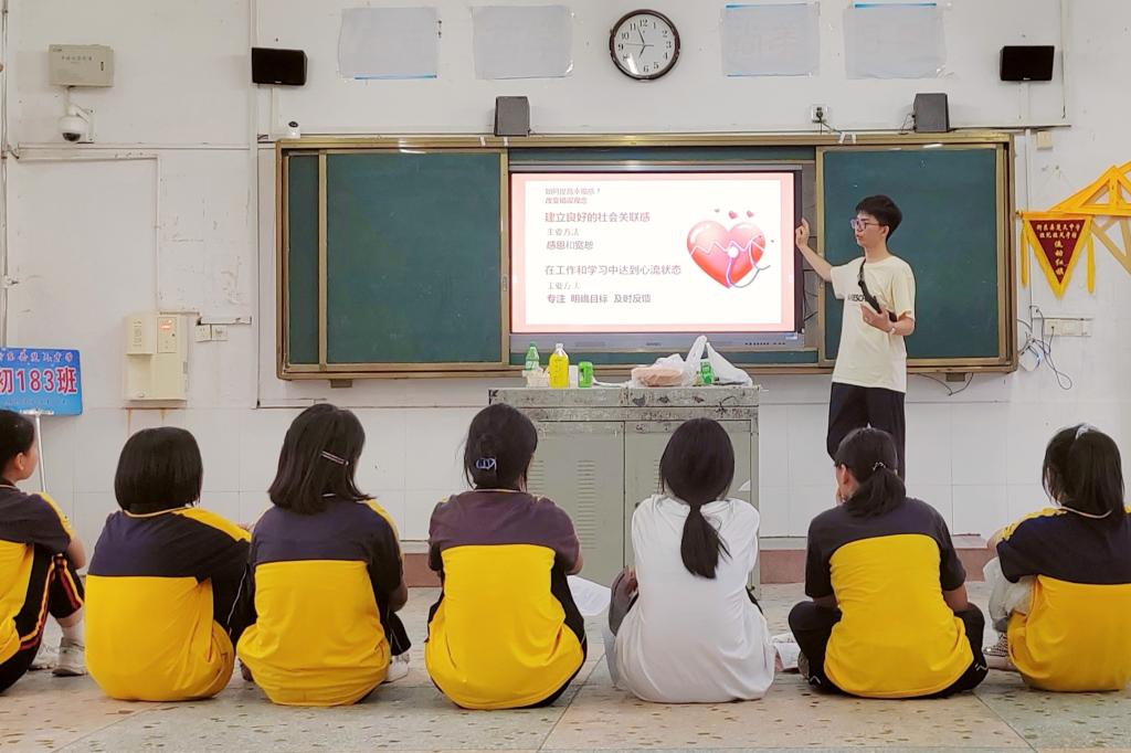 组建“以爱赋能,心向未来”大学生心理健康服务暑期社会实践团。该团队由5位心理委员组成,每位团队成员均接受过心理委员的系列专业培训。暑期,实践团成员分赴湖南省衡阳市衡东县第一中学和楚天中学,在无锡市、衡东县开展了心理问卷调查、心理健康知识普及、团体心理辅导等心理健康教育系列活动,为当地的青少年和家长送去夏日里的“舒心”小妙招。