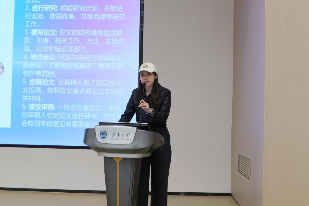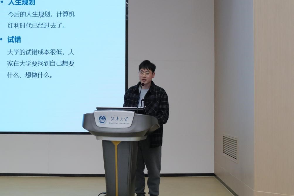 计算机技术2022级研究生肖勇飚向同学们讲解了本科阶段的准备和研究生阶段的学习与生活日常。他为对读研有意向的同学们进行解答,讲述了研究生科研的三大方向:论文、竞赛和项目,着重讲解了论文的查询与写作流程,尤其是针对如何复现实验与找到创新点方面提出独到的见解。谈到研究生的生活是怎样时,他强调研究生仍然要以学业为主,鼓励同学们做到“书山有路勤为径,学海无涯苦作舟”。最后也对大一大二的同学们给出衷心的建议,希望同学们能做好人生规划,加强知识积累,永远不要怕犯错,学会慎独,笃心学习。
