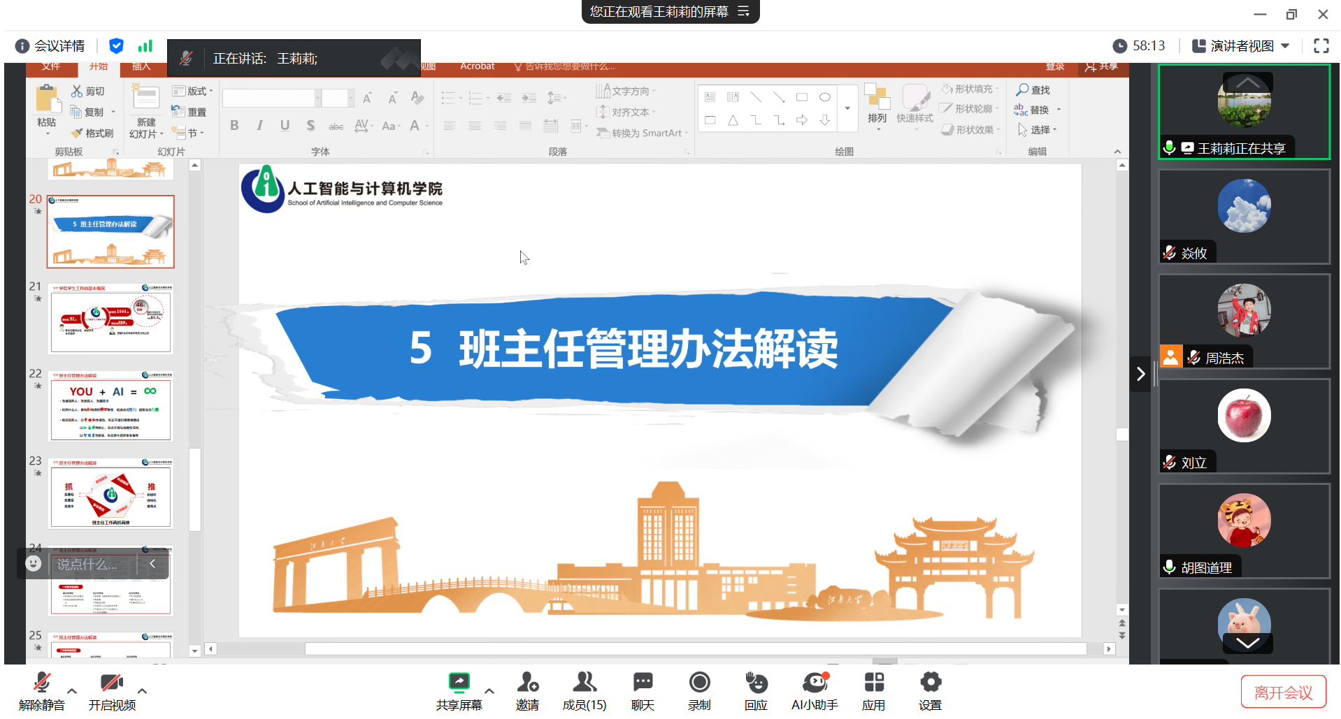 迎新总体方案》,重点围绕新生报到前后、军训主要安排、新生转型教育等内容进行了部署。杨玉莹从大一新生常见的心理问题、主要诱因、特征表现、识别途径、预防干预等方面详细领学了新生入校的常见问题及应对措施。班主任代表周浩杰从班主任是什么、为何做班主任、怎样做好班主任三个层面交流心得体会,并重点围绕以文化建设凝聚人心、以科创竞赛促进学风建设、以定期交流谈话走进学生群体等方面分享了工作方法与技巧。
