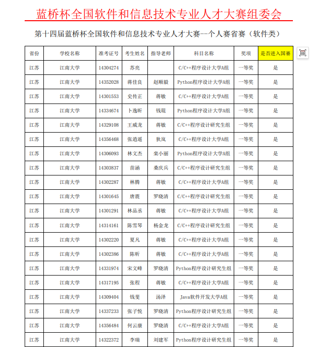 近日,第十四届“蓝桥杯”全国软件和信息技术专业人才大赛个人赛江苏省赛落下帷幕,大赛吸引来自南京大学、东南大学、南京理工大学、苏州大学等众多高校的选手同台竞技。我校学子在比赛中沉着冷静,出色发挥,人工智能与计算机学院学生勇夺佳绩,在软件类赛道中共夺得一等奖14项,二等奖36项,三等奖61项,14人取得国赛参赛资格,并确定将代表学校参加第十四届“蓝桥杯”软件类全国总决赛。