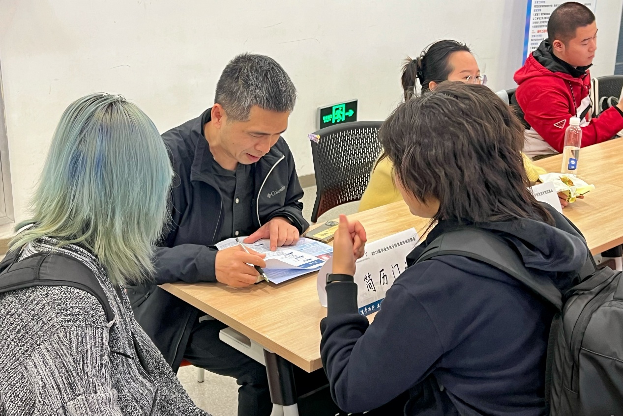 各企业单位向求职学生热情介绍自身污污漫、招聘需求、福利待遇、产业结构等,真诚邀请学生加入。求职学生认真聆听,与用人单位充分交流,积极投递简历。双选会现场设置“简历优化”“征兵咨询”“留学咨询”“导向就业”等多个服务专区,为毕业生顺利步入职场提供全过程、全方位的帮扶与支持。各承办学院毕业班辅导员、班主任和部分专业教师也在现场与用人单位进行主动对接,向用人单位积极推介优秀毕业生。