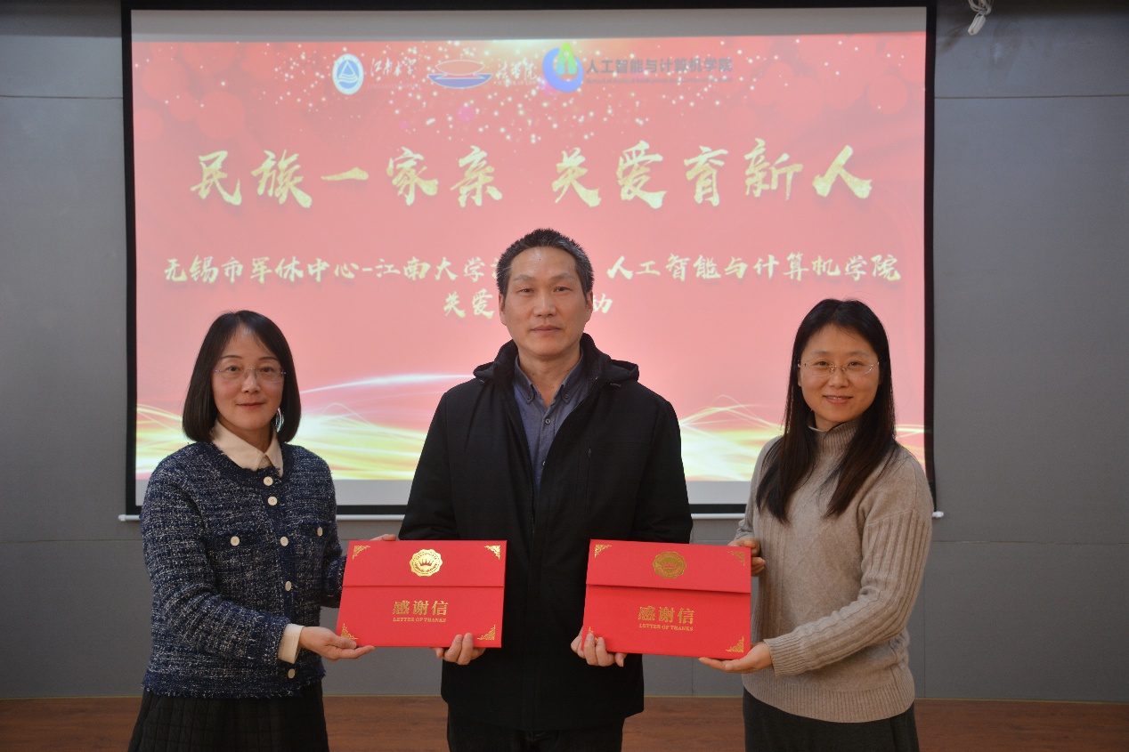 岁末暖冬聚温情,民族团结谱新篇。2025年12月31日下午,江南大学人工智能与计算机学院B310活动室暖意融融,无锡市军休中心与江南大学人工智能与计算机学院、法学院联合举办的“民族一家亲,关爱育新人”新春慰问活动在此圆满举行。无锡市军休中心党委委员、副主任黄正国,各服务站领导及军休干部代表,江南大学法学院党委副书记、副院长顾云艳,人工智能与计算机学院党委副书记、副院长王莉莉,两院辅导员及36名少数民族学生代表齐聚一堂,共话军民情谊,共叙民族团结。