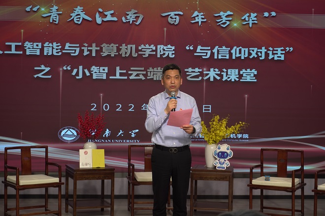 为丰富充实疫情期间的文化生活,喜迎二十大,激昂青春奋斗,在音乐沉浸中感受信仰的力量。5月6日下午,“青春江南 百年芳华”——人工智能与计算机学院“与信仰对话”之“小智上云端”艺术课堂顺利举办。无锡市教育系统关工委常务主任张志新、无锡市教育信息化和装备管理服务中心主任顾军、江南大学团委书记魏珍吉,江南大学关工委副主任娄国栋,人工智能与计算机学院党委书记张华,党委副书记兼副院长陈祎,江南大学特邀党建组织员曹秋萍出席活动,本次活动采用线上直播方式进行,校内外师生近75000人次通过直播平台参加线上互动。
