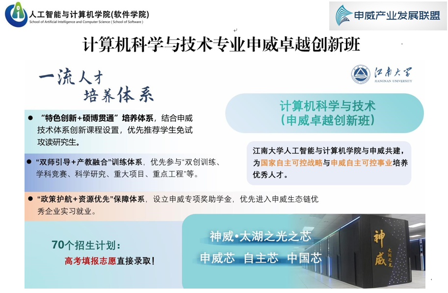 于 1994 年开设的计算机科学与技术专业,该专业入选首批国家级一流本科专业建设点,已经通过中国工程教育认证,是国家级特色专业建设点、入选了江苏省产教融合品牌专业;也已经与国家超级计算无锡中心等单位共同建设了“基于国产基础软硬件的人工智能信创实验室”、先进计算与控制江苏省产教融合重点基地,是无锡市示范产业学院的重点建设专业。我们相信,在此基础上一定能够培养出优秀的设计申威计算机和应用申威计算机的创新型人才。