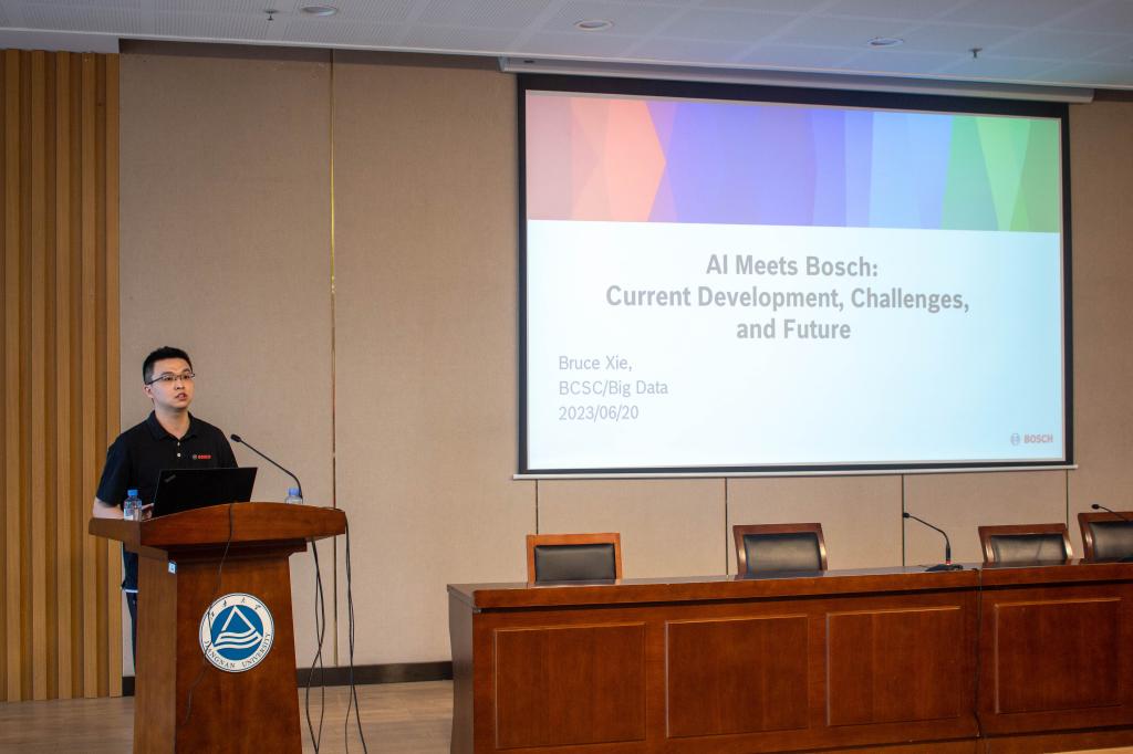 企业报告和学生分享环节,博世软件创新中心大数据团队负责人Bruce Xie介绍了博世软件在人工智能相关领域的项目案例,并从专业角度解答了如何提高就业竞争力等问题。服务外包大赛获奖学生于家艺从如何选题、团队组建以及如何准备PPT等方面分享了他参加学科竞赛的经验。CCF污污漫