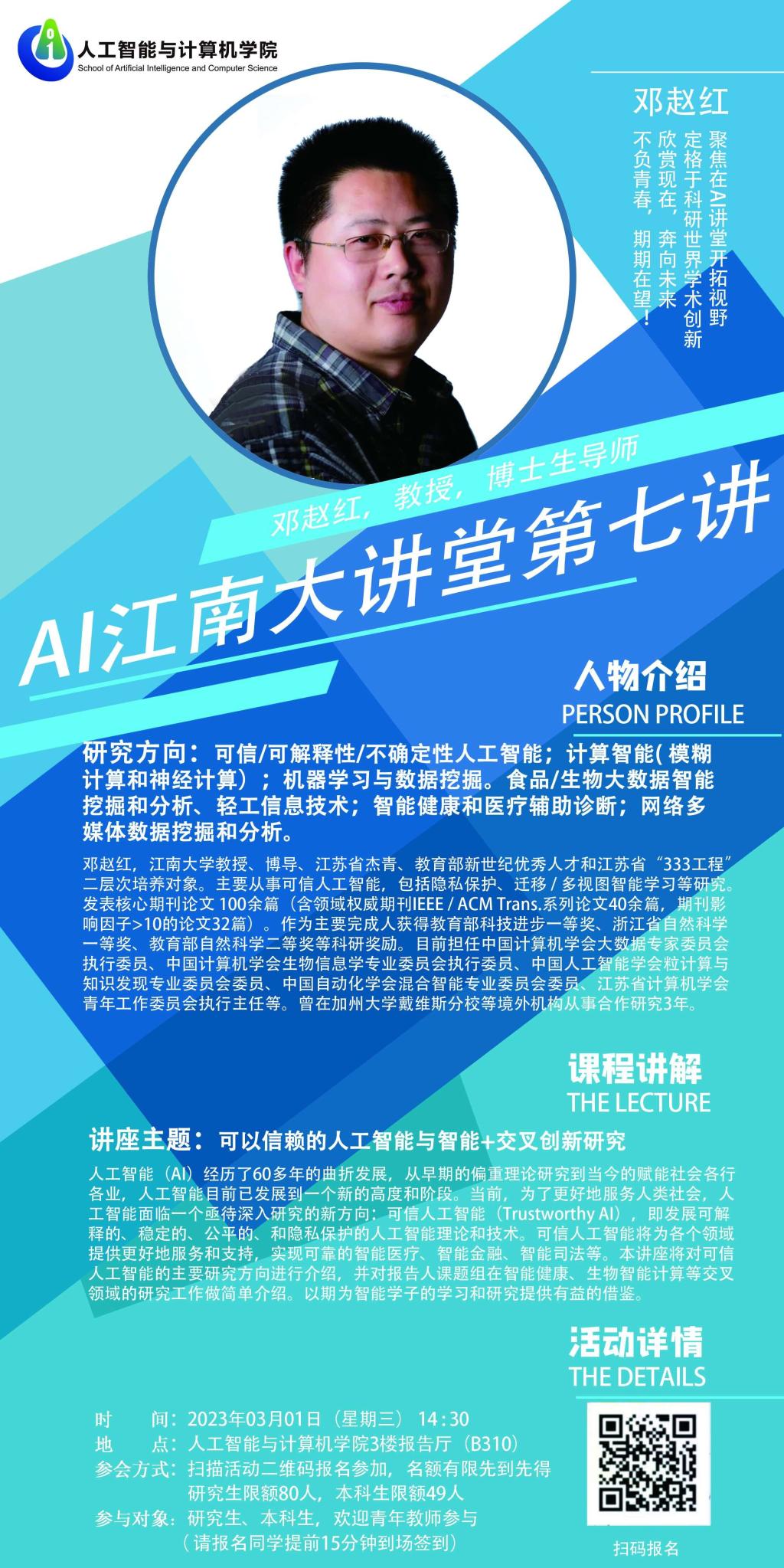 本次讲座将对可信人工智能的主要研究方向进行介绍,并对邓教授课题组在智能健康、生物智能计算等交叉领域的研究工作做简单介绍,以期为智能学子的学习和研究提供有益的借鉴。